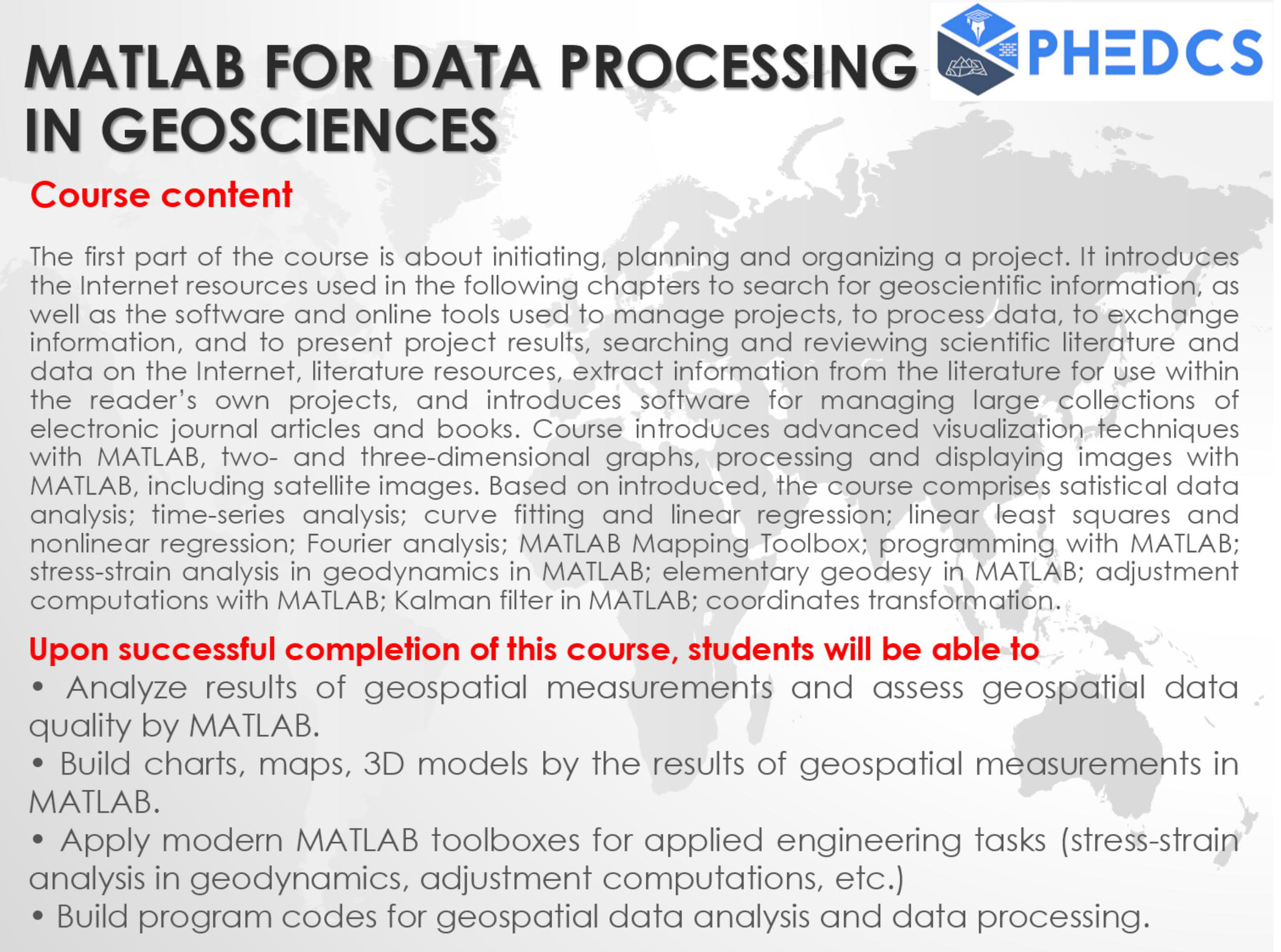 The primary goal of the training is the study of state-of-the-art geodetic methods and technologies for the geodetic support of underground structures construction and exploitation. The course comprises the approaches to geodetic network creation and their simulation using miscellaneous software and other various software, the strict calculation of the breakthrough value, the study of the different methods to the transition of coordinates and directions underground, the technology of the tunnel boring machine orientation, and geospatial monitoring. Essential attention will be given to geospatial monitoring data processing using MATLAB.